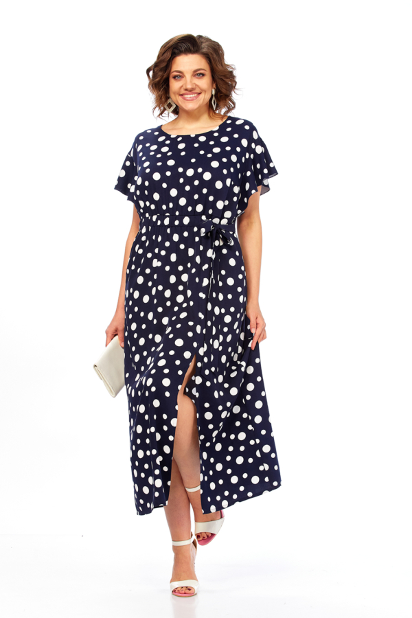 Платье женское, выполнено из натуральной плательной ткани, А-силуэта. Горловина округлой формы. Перед с нагрудными вытачками. По линии талии кулиса на резинке с выходящем из нее поясом из основной ткани. Разрез по переду ассиметричный. Спинка разрезная с вырезом “капля” и застежкой на навесную петлю и пуговицу. Рукава — крылышки втачиваются до…