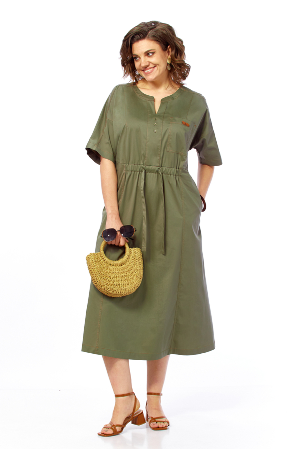 Платье женское, повседневное свободного силуэта, выполнено из плательной ткани. Горловина округлой формы с V-образным разрезом. Платье по переду отрезное по линии талии с кулисой по центру. В верхней части переда платья обработаны нагрудные вытачки выходящие из кокетки, накладной карман и по центру имитация планки, декорированной пуговицами. В нижней части рельефы…