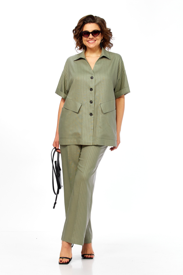 Комплект женский брючный двухпредметный, состоит из джемпера и брюк. Джемпер свободного кроя, изготовлен из трикотажного полотна. Горловина обработана воротником-стойкой и планками с застежкой на петли и пуговицы. Рукава спущенные, с манжетами. По низ изделия притачная деталь с разрезами по бокам. На полочке джемпера расположена вышивка. Брюки прямого силуэта, выполнены из…