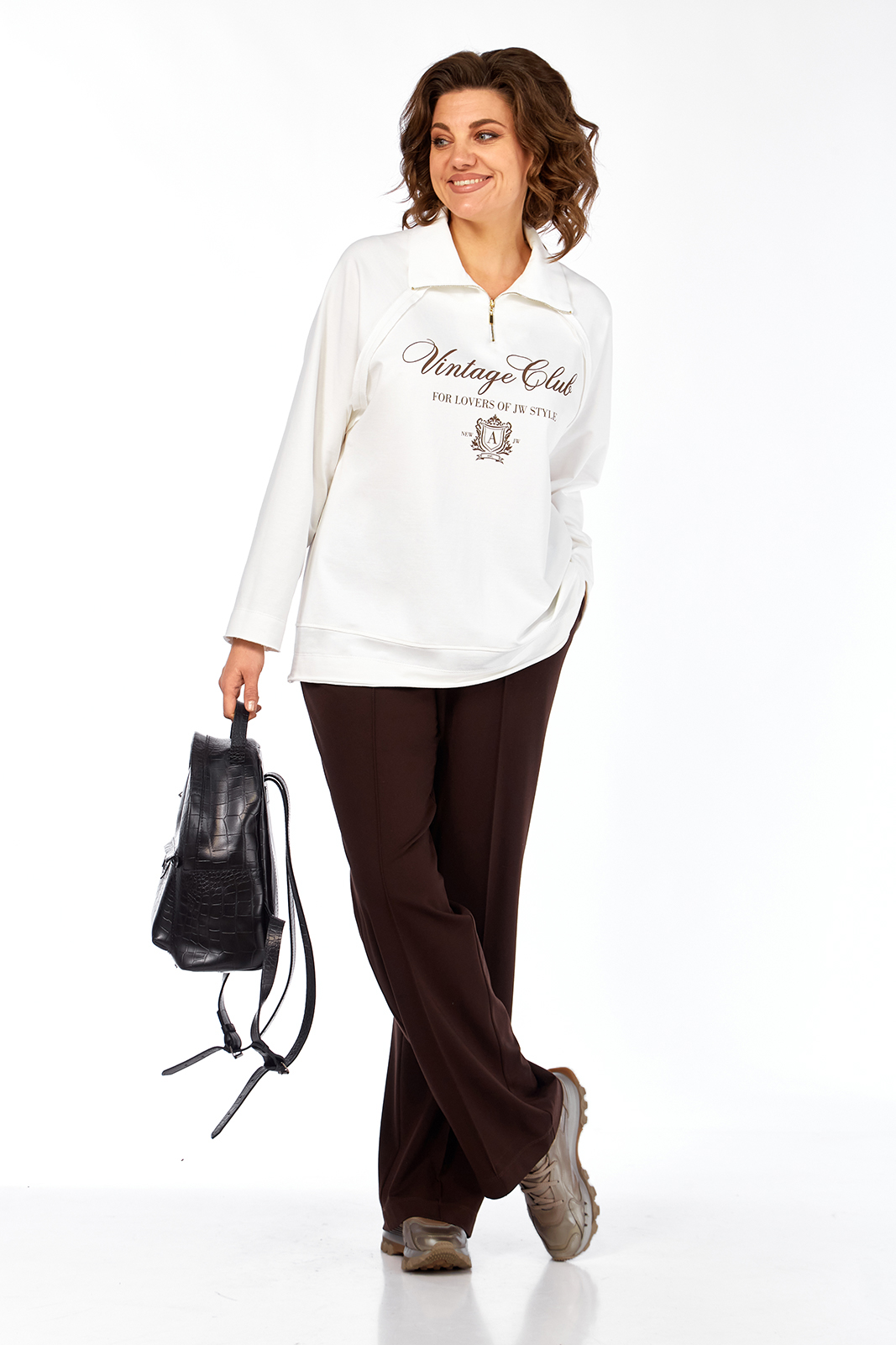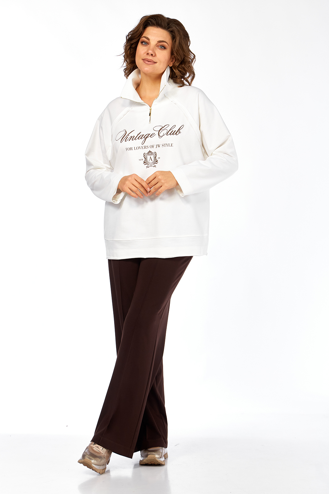 Комплект брючный двухпредметный, состоит из джемпера и брюк. Джемпер свободного силуэта изготовлен из хлопкового полотна, с воротником стойка на молнии. Перед и спинка в области бедер с декоративным подрезом. Рукава — реглан. Низ изделия,низ рукавов и швы втачивания рукавов выполнены необработанным срезом. Джемпер дополнен дизайнерской печатью. Брюки прямого силуэта с притачным поясом на эластичной тесьме. В передних деталях брюк обработаны боковые карманы и застрочены канты.