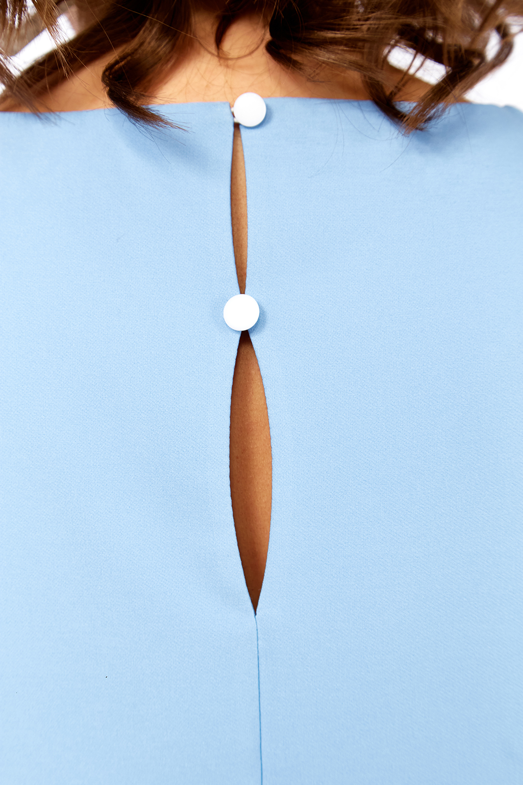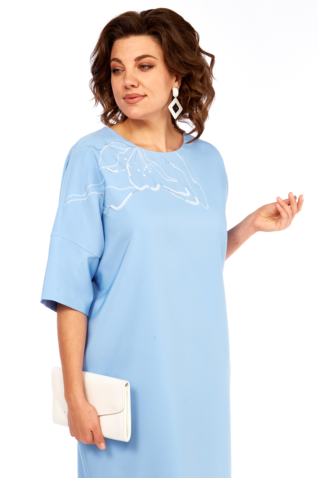 Платье женское, нарядное свободного силуэта. Выполнено из ткани костюмно-плательного ассортимента. Горловина округлой формы. Перед цельнокроеный дополнен дизайнерской вышивкой. Спинка со средним швом в котором обработана застежка на навесную петлю и пуговицу. Рукав спущенный.
