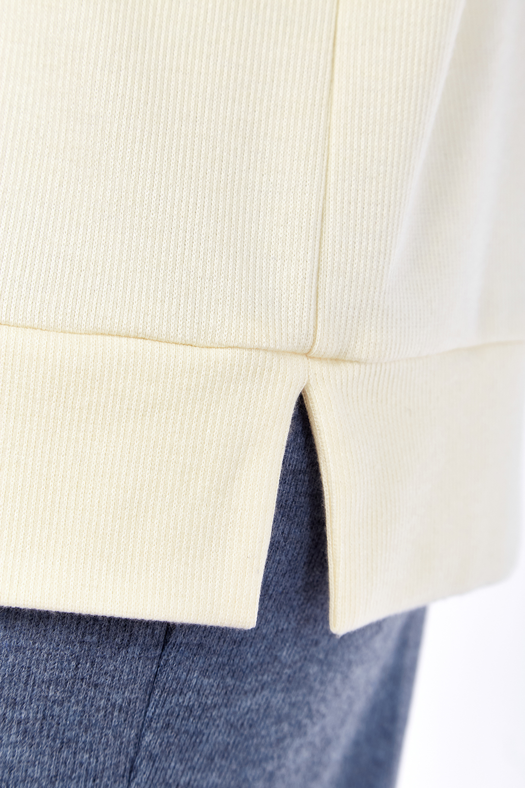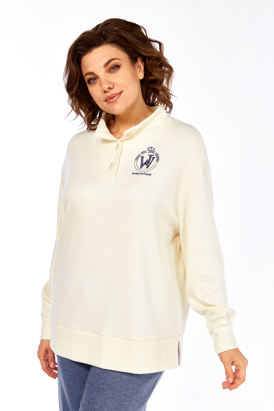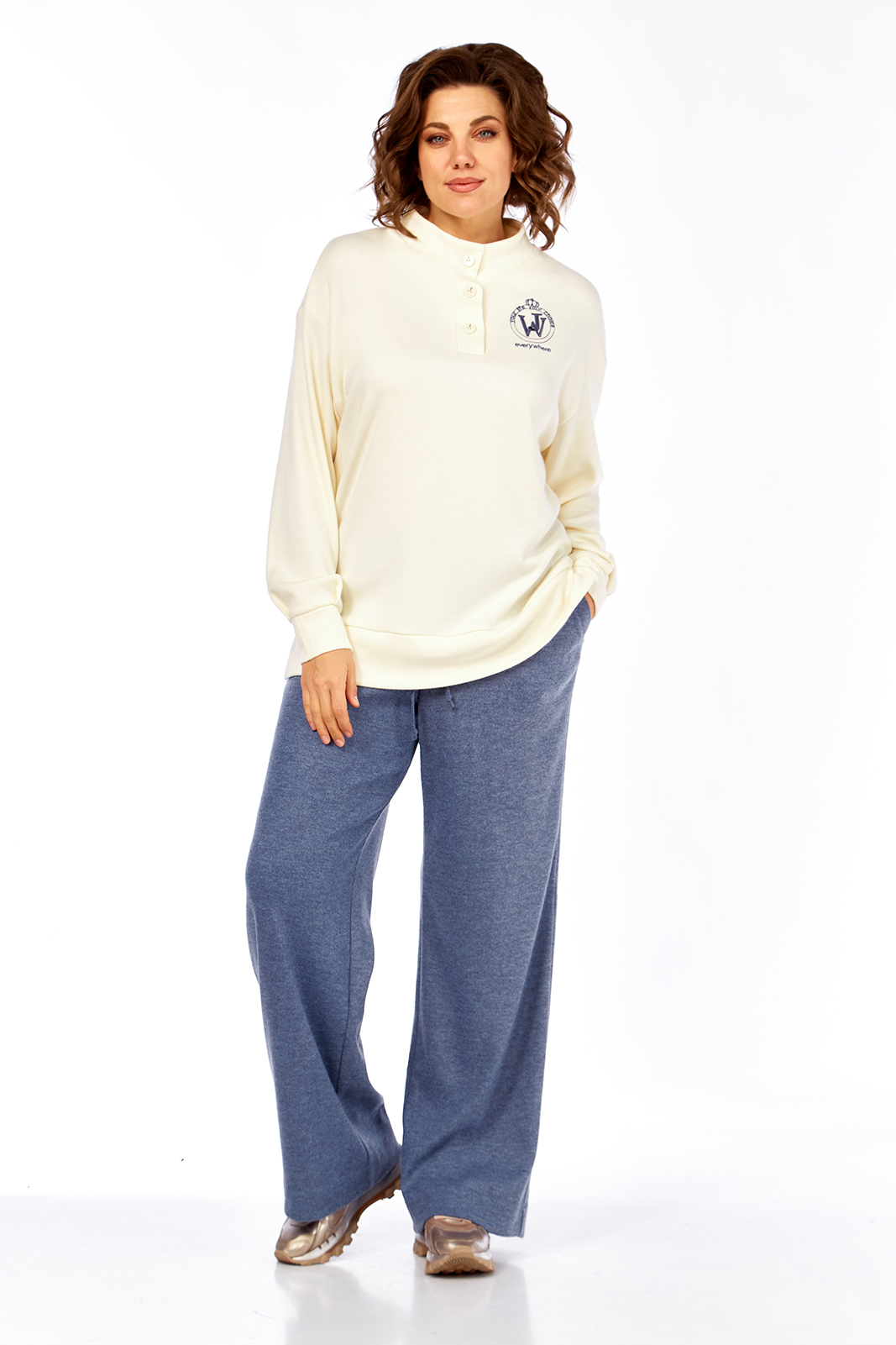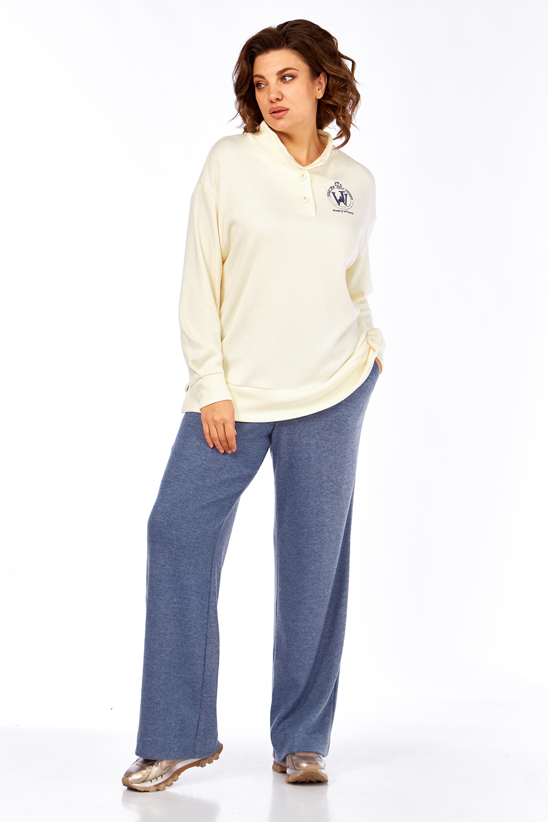 Комплект женский брючный двухпредметный, состоит из джемпера и брюк. Джемпер свободного кроя, изготовлен из трикотажного полотна. Горловина обработана воротником-стойкой и планками с застежкой на петли и пуговицы. Рукава спущенные, с манжетами. По низ изделия притачная деталь с разрезами по бокам. На полочке джемпера расположена вышивка. Брюки прямого силуэта, выполнены из трикотажного полотна. В передних деталях брюк обработаны карманы. Пояс притачной на эластичной тесьме.