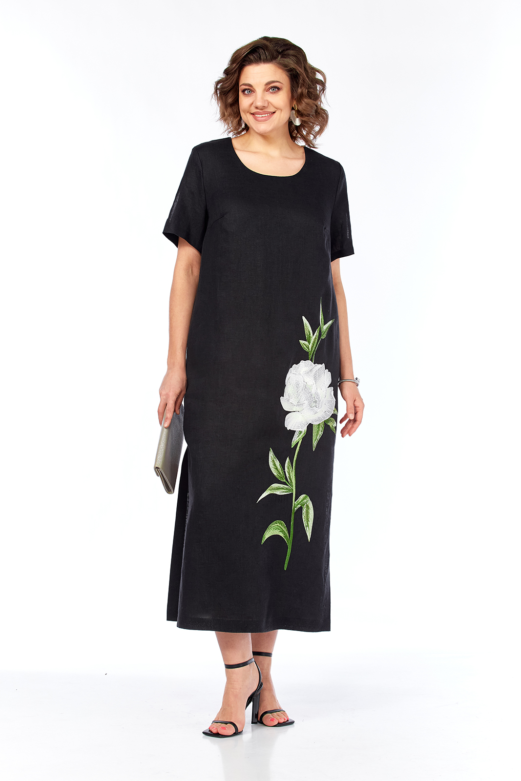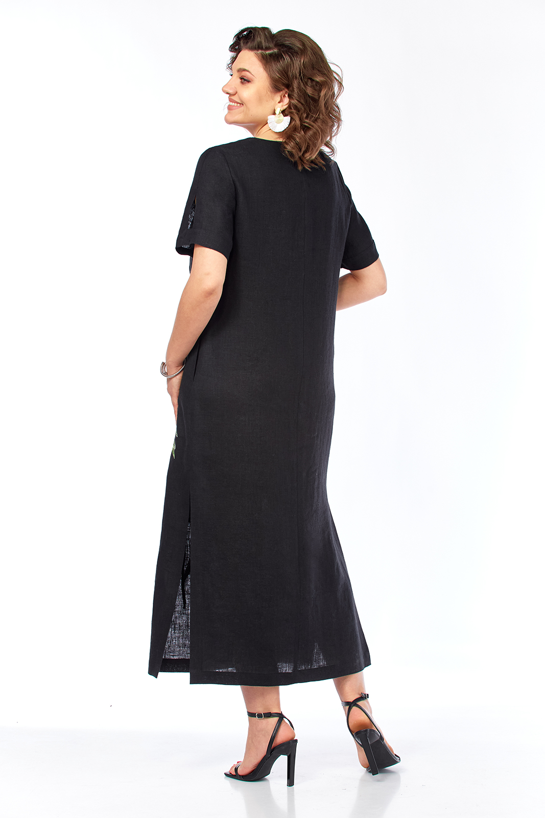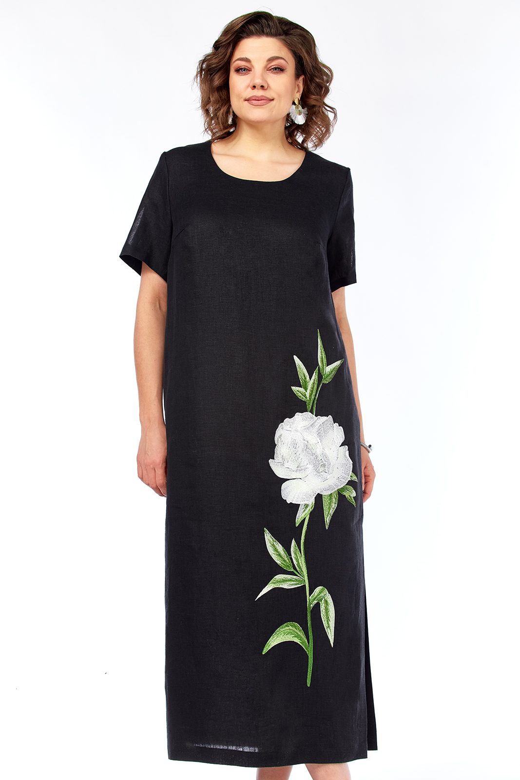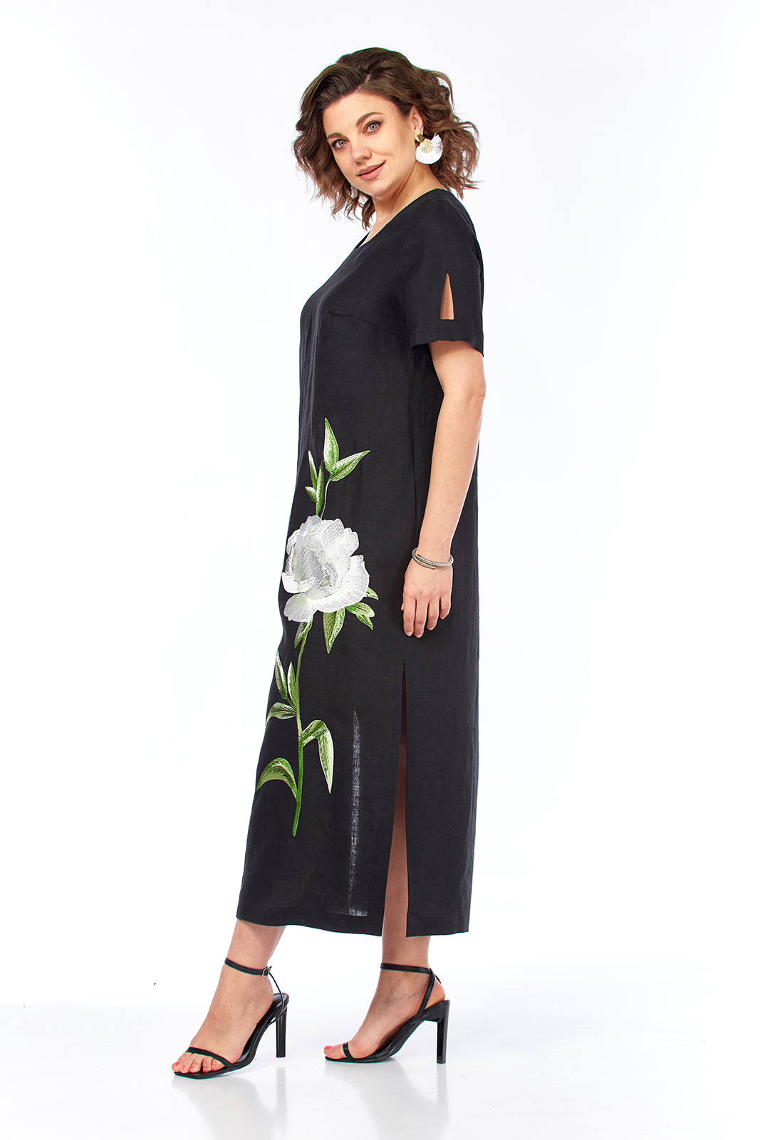 Платье женское прямого силуэта, изготовлено из натуральной ткани. Горловина круглой формы. По переду обработаны нагрудные вытачки. На спинке средний шов. В боковых швах обработаны карманы, внизу разрезы. Рукава втачные, разрезные с фигурным вырезом. Платье декорировано дизайнерской вышивкой.