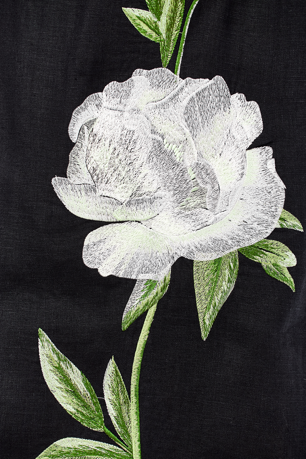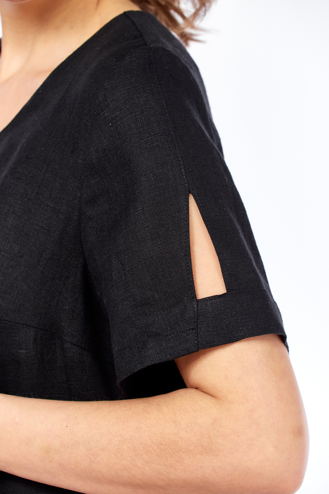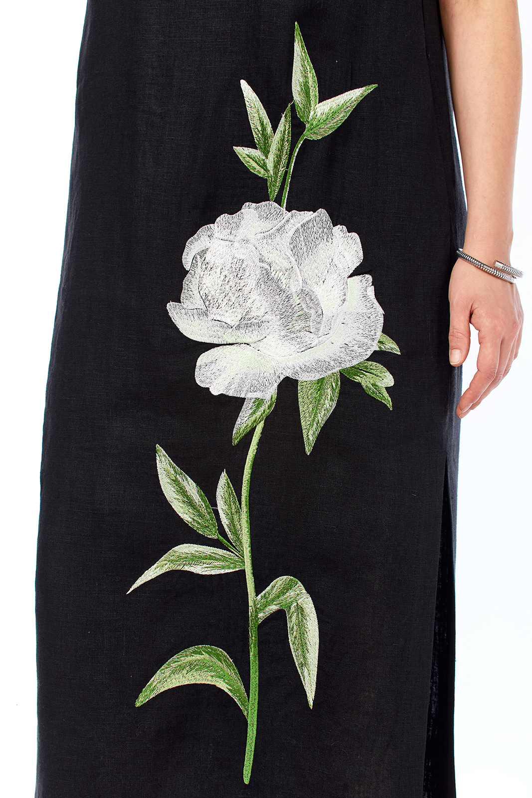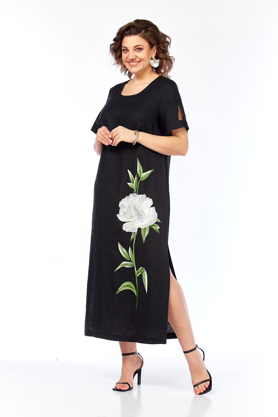 Платье женское прямого силуэта, изготовлено из натуральной ткани. Горловина круглой формы. По переду обработаны нагрудные вытачки. На спинке средний шов. В боковых швах обработаны карманы, внизу разрезы. Рукава втачные, разрезные с фигурным вырезом. Платье декорировано дизайнерской вышивкой.
