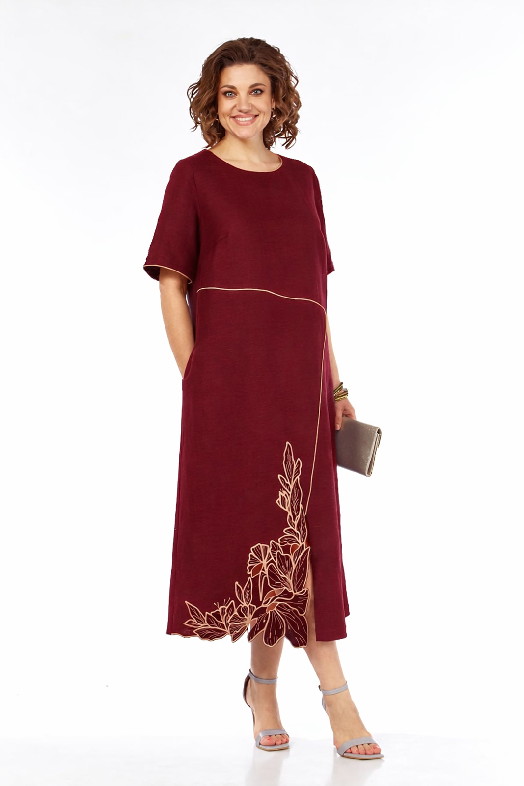 Платье женское, А- силуэта, выполнено из натуральной льняной ткани. Горловина округлой формы, обработана контрастным кантом. Перед с ассиметричными подрезами и нагрудными вытачками. Подрезы выделены контрастным кантом. Спинка со средним швом, в котором обработана застежка на навесную петлю и пуговицу. Рукава втачные. Платье дополнено дизайнерской вышивкой в технике ришелье.