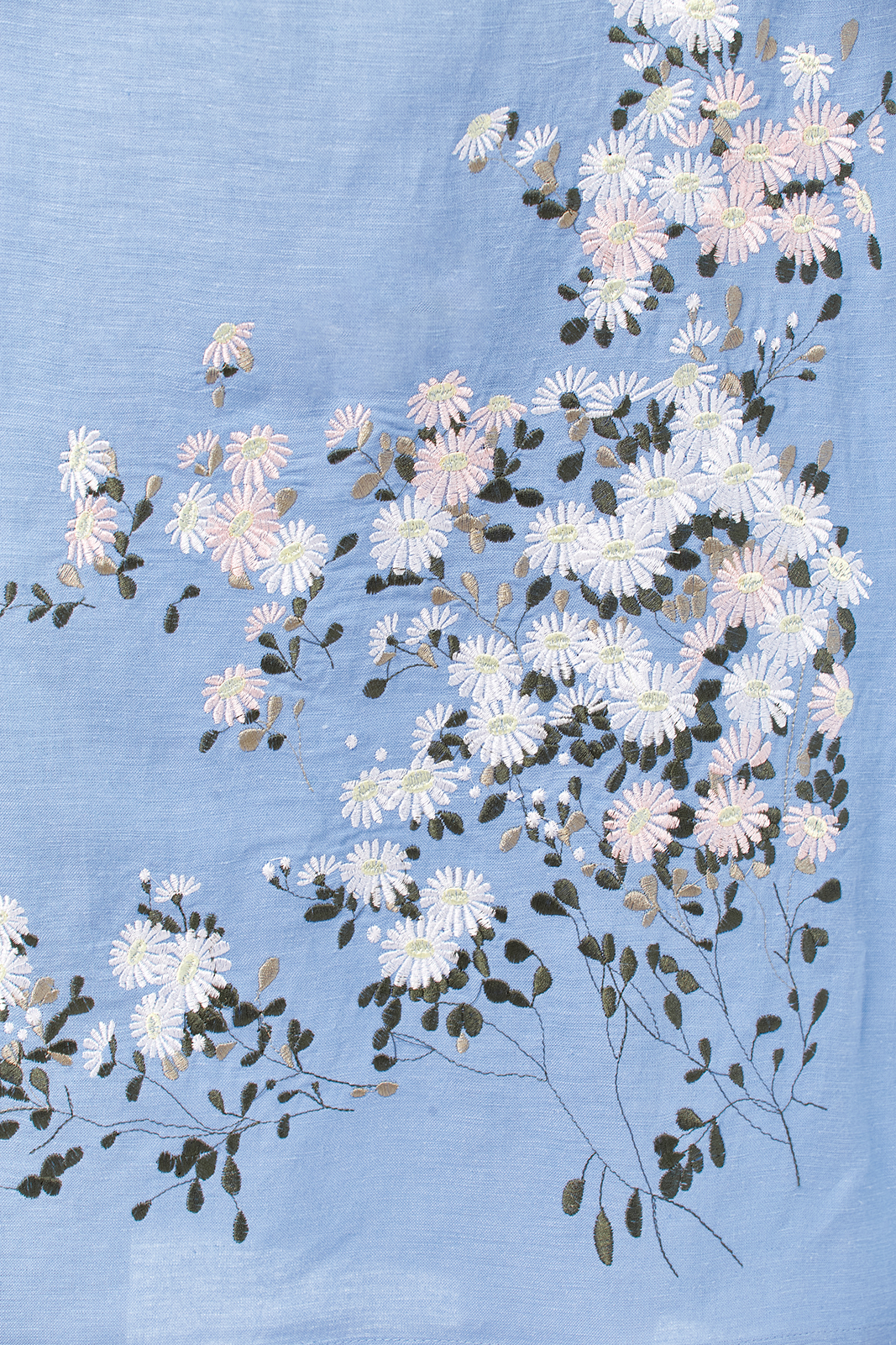 Платье женское, прямого силуэта, выполнено из натуральной ткани. Горловина округлой формы. Перед с нагрудными вытачками и косым подрезом. Рукава втачные по окату небольшая сборка, низ рукава фигурной формы. В боковых швах обработаны карманы. Платье дополнено дизайнерской вышивкой.