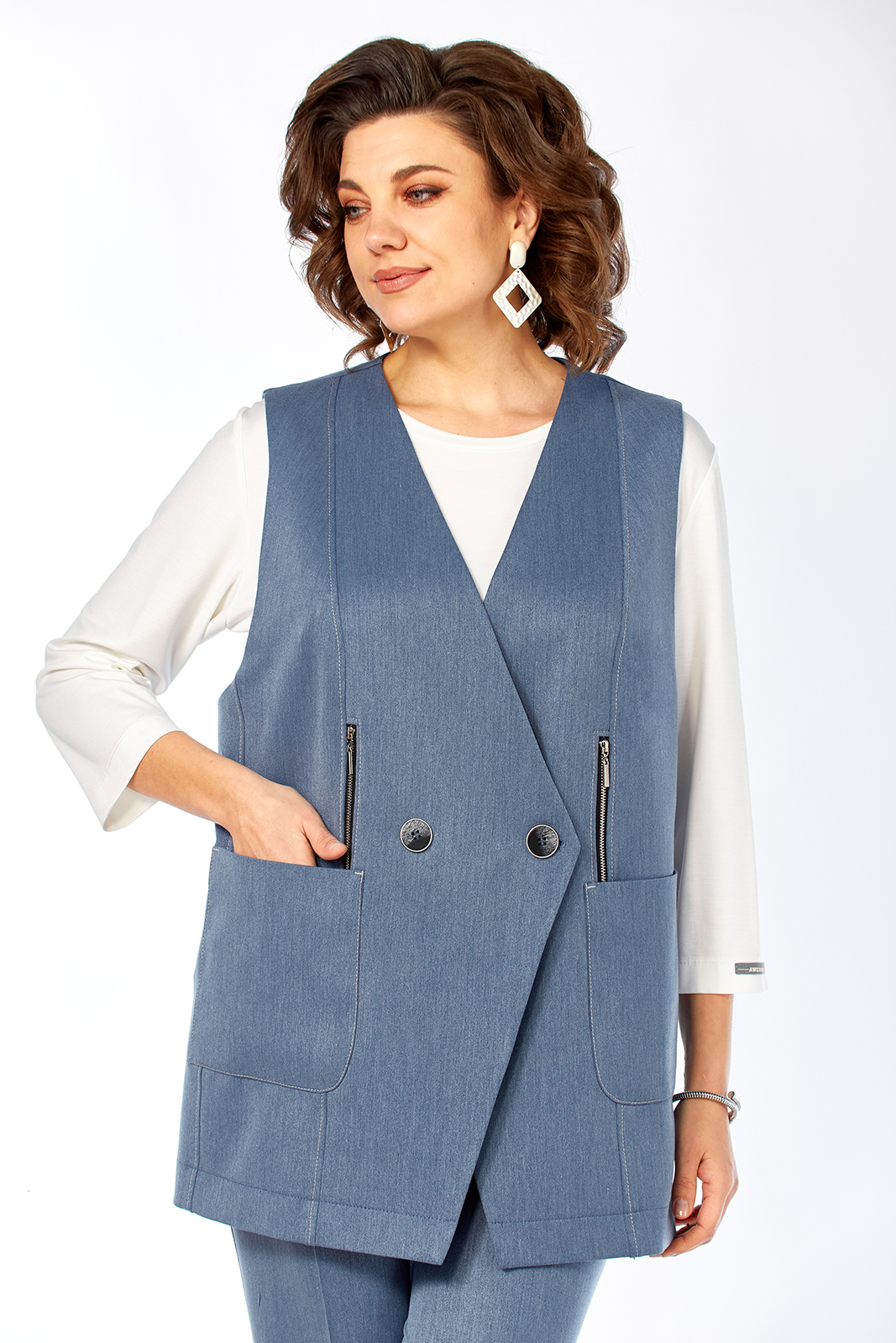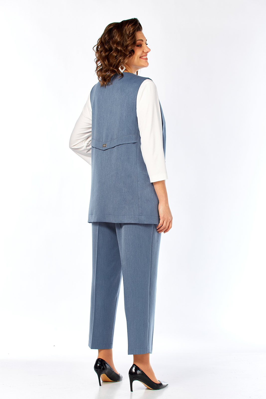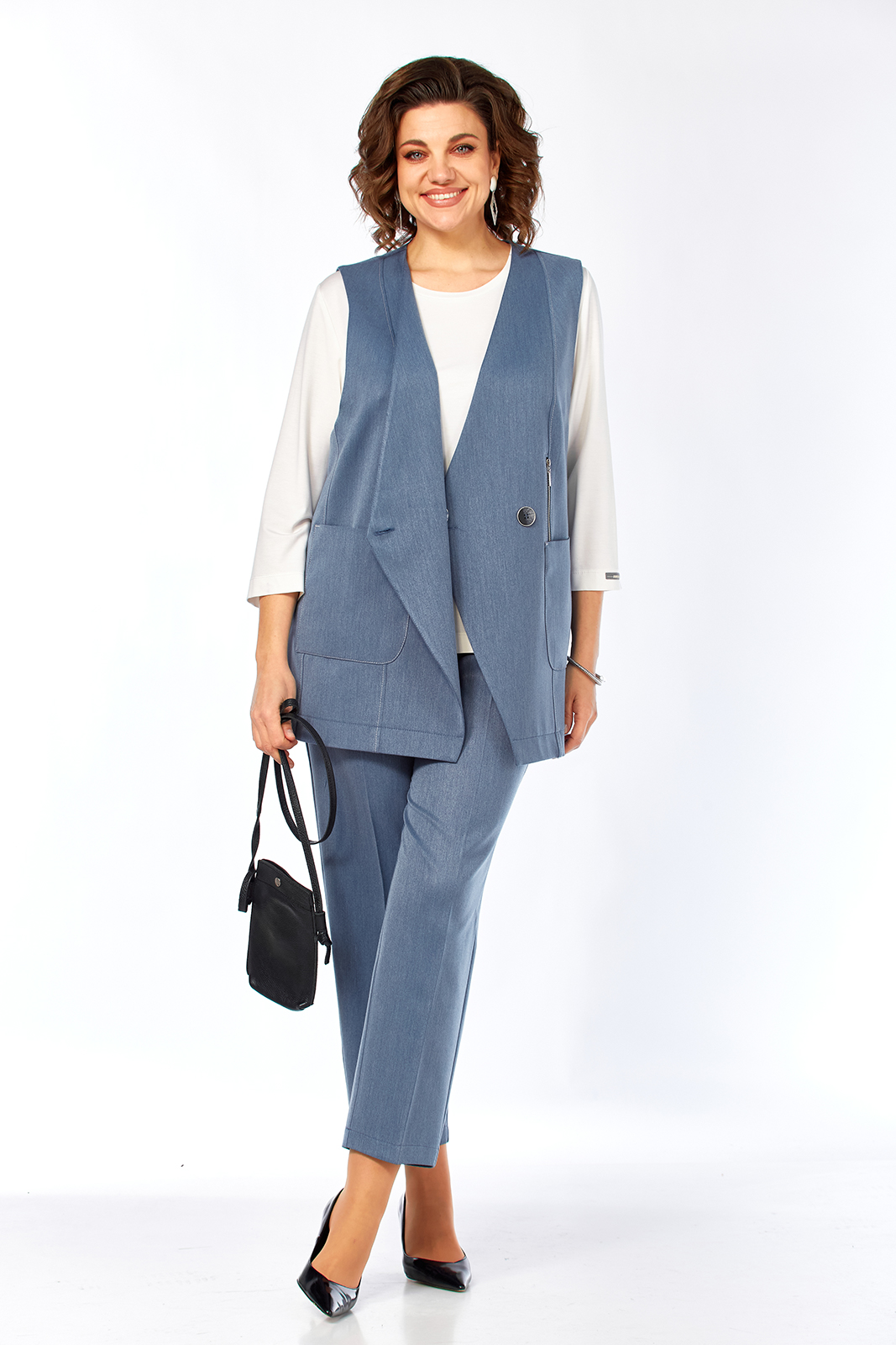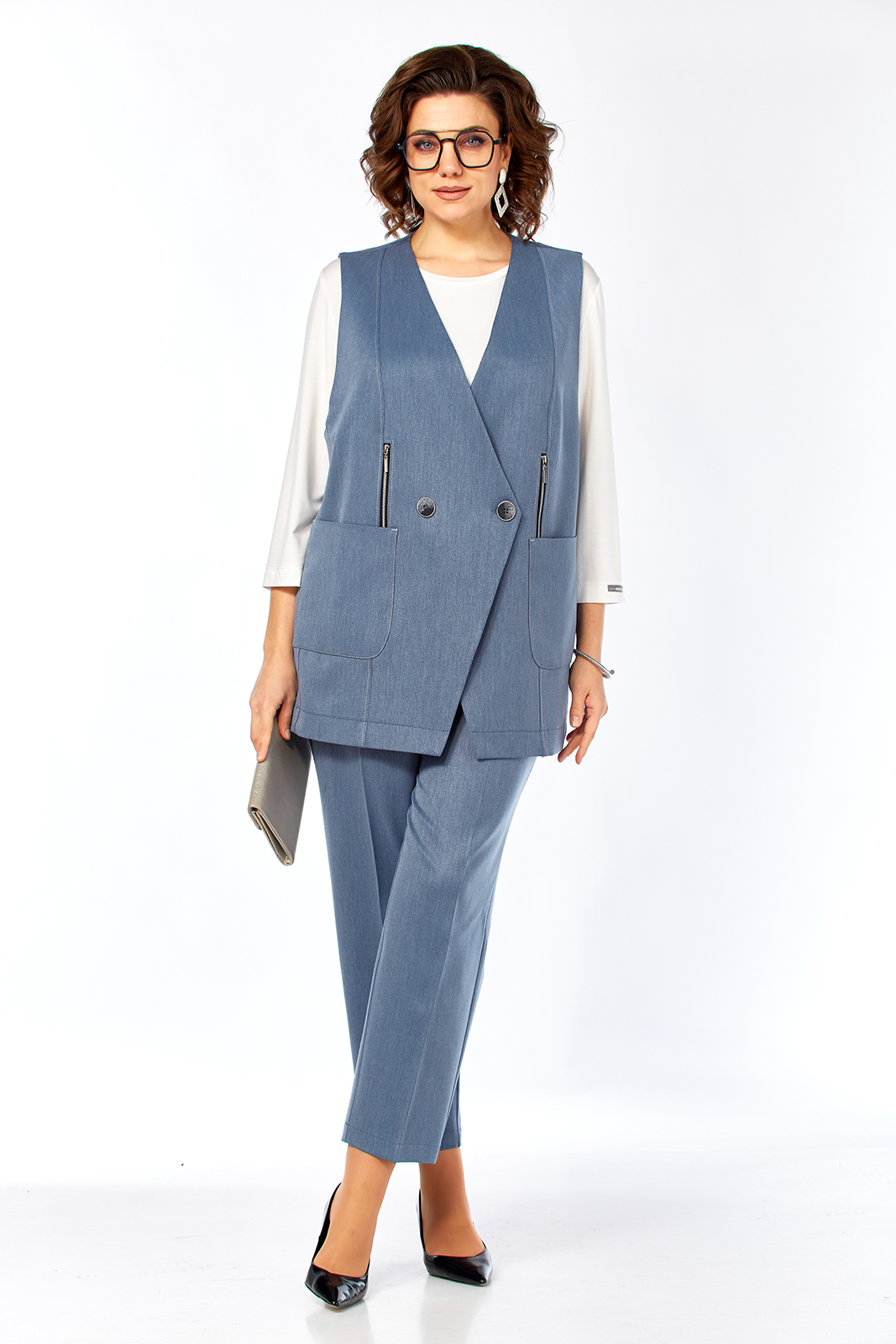 Костюм брючный 3х — предметный, состоит из жилета, лонгслива и брюк. Жилет и брюки выполнены из костюмной ткани, лонгслив из трикотажного вискозного полотна. Жилет прямого силуэта с двубортной застежкой на петлю и пуговицу. Горловина V-образной формы. По переду обработаны накладные карманы, в рельефах декоративные элементы с молниями. Спинка с фигурной кокеткой. Брюки свободного силуэта, с притачным поясом и вставками эластичной тесьмы. Застежка на петлю и пуговицу. В передних деталях брюк обработаны карманы с подрезным бочком. Лонгслив прямого силуэта, перед и спинка цельнокроеные, рукава втачные. Горловина обработана бейкой.