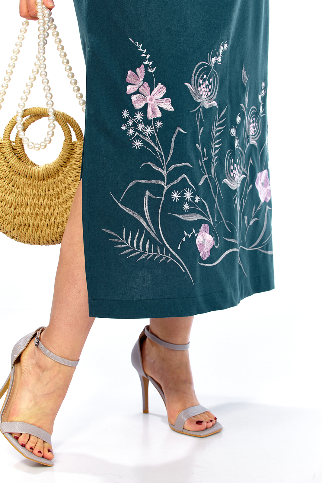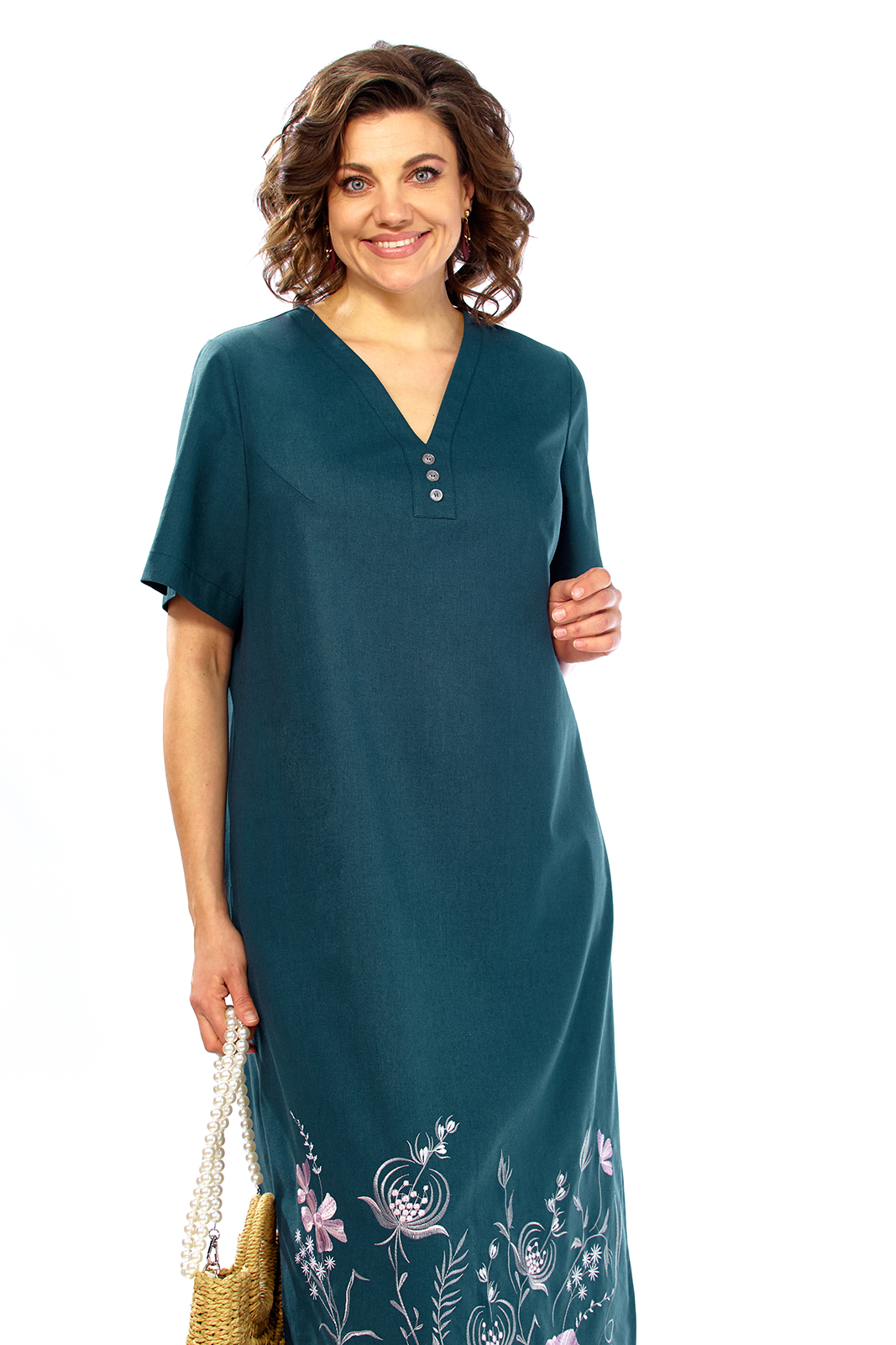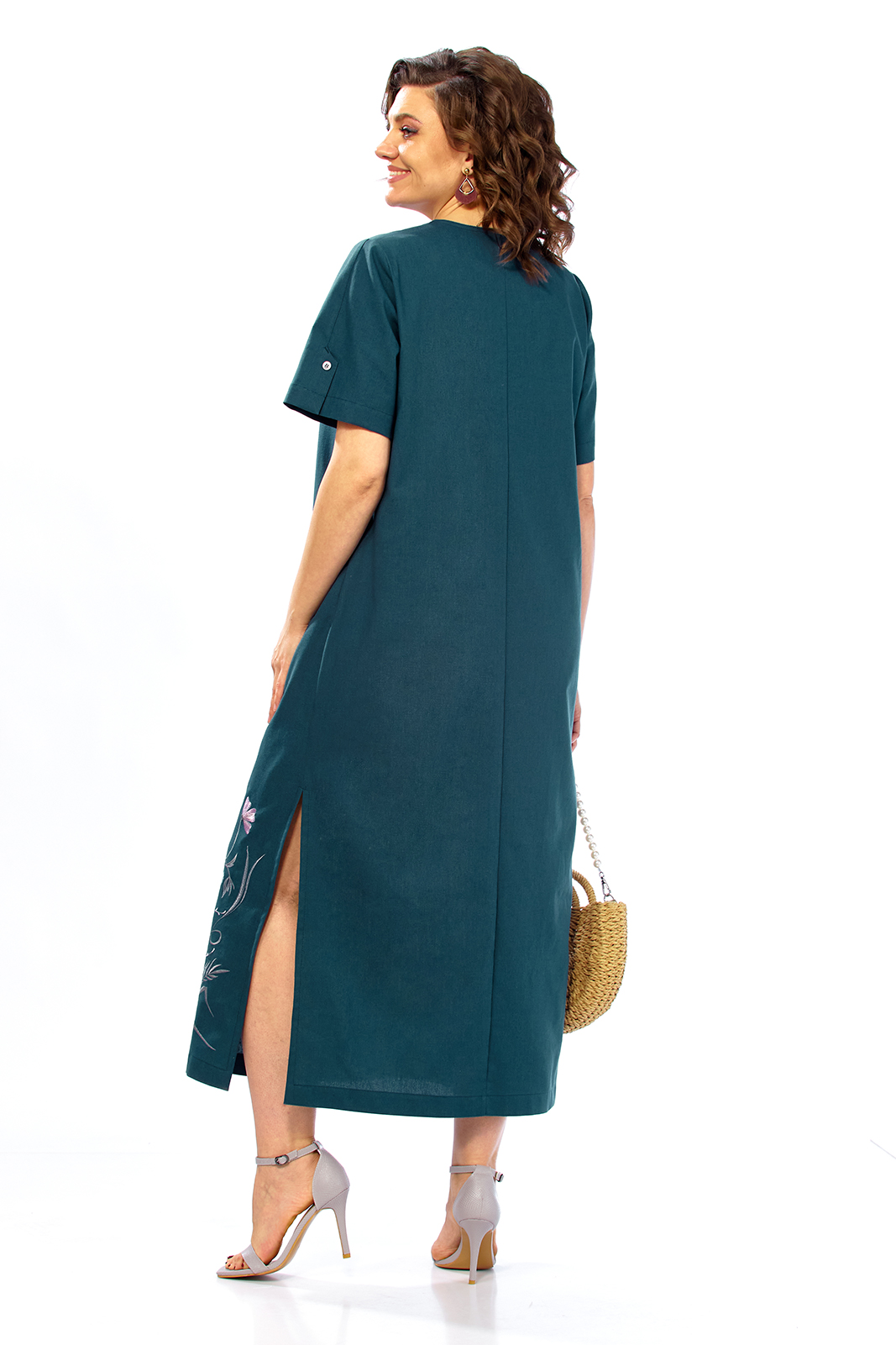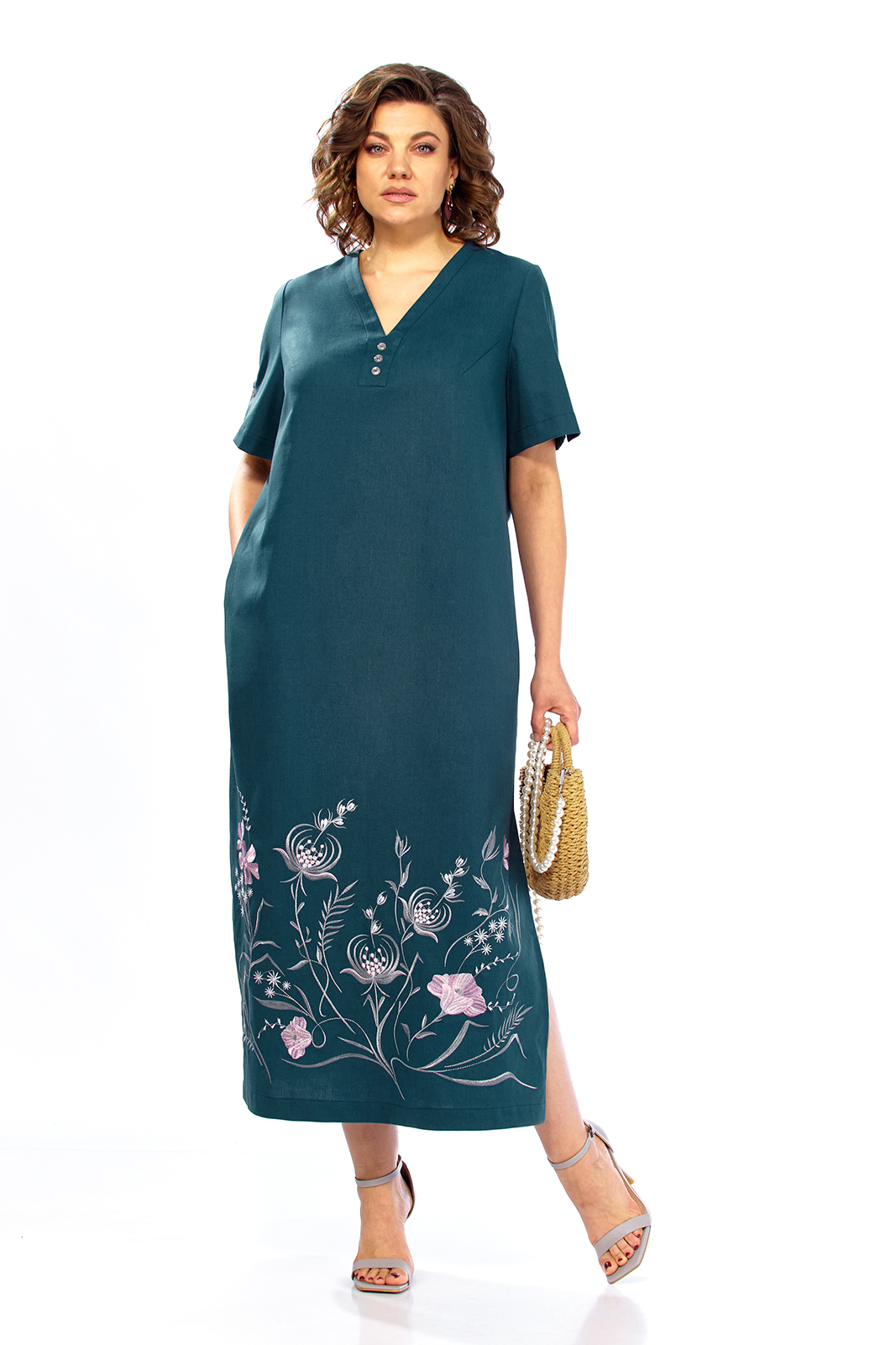 Платье женское летнее, выполнено из натуральной ткани, прямого силуэта. Горловина V-образной формы, обработана декоративной планкой. Перед с нагрудными вытачками. Спинка цельнокроенная. Рукава втачные с фигурными шлицами. В боковых швах обработаны карманы и разрезы внизу. Платье декорировано дизайнерской вышивкой.