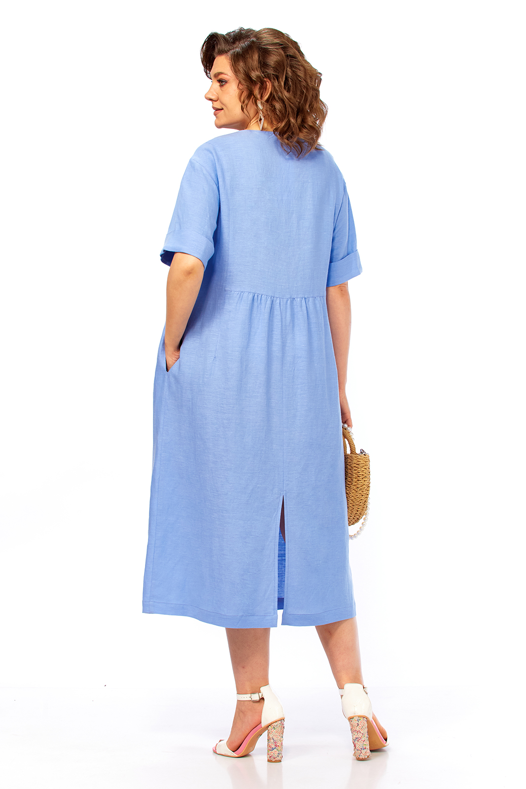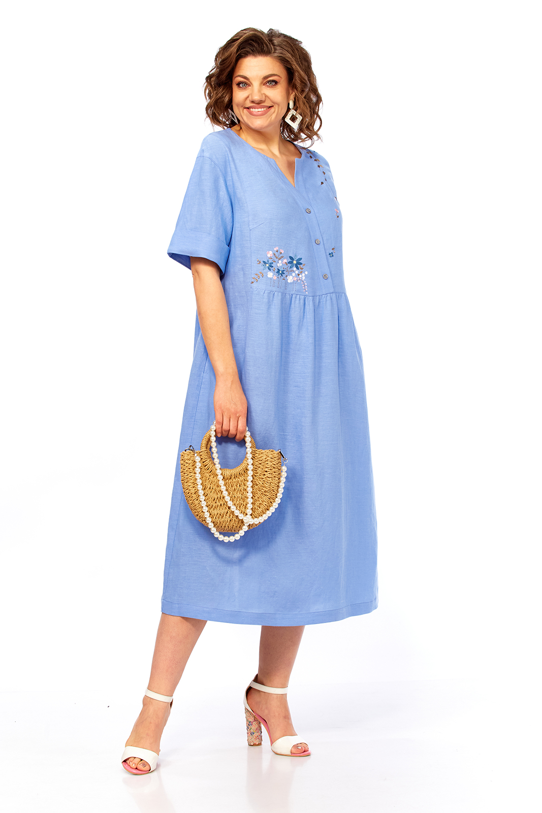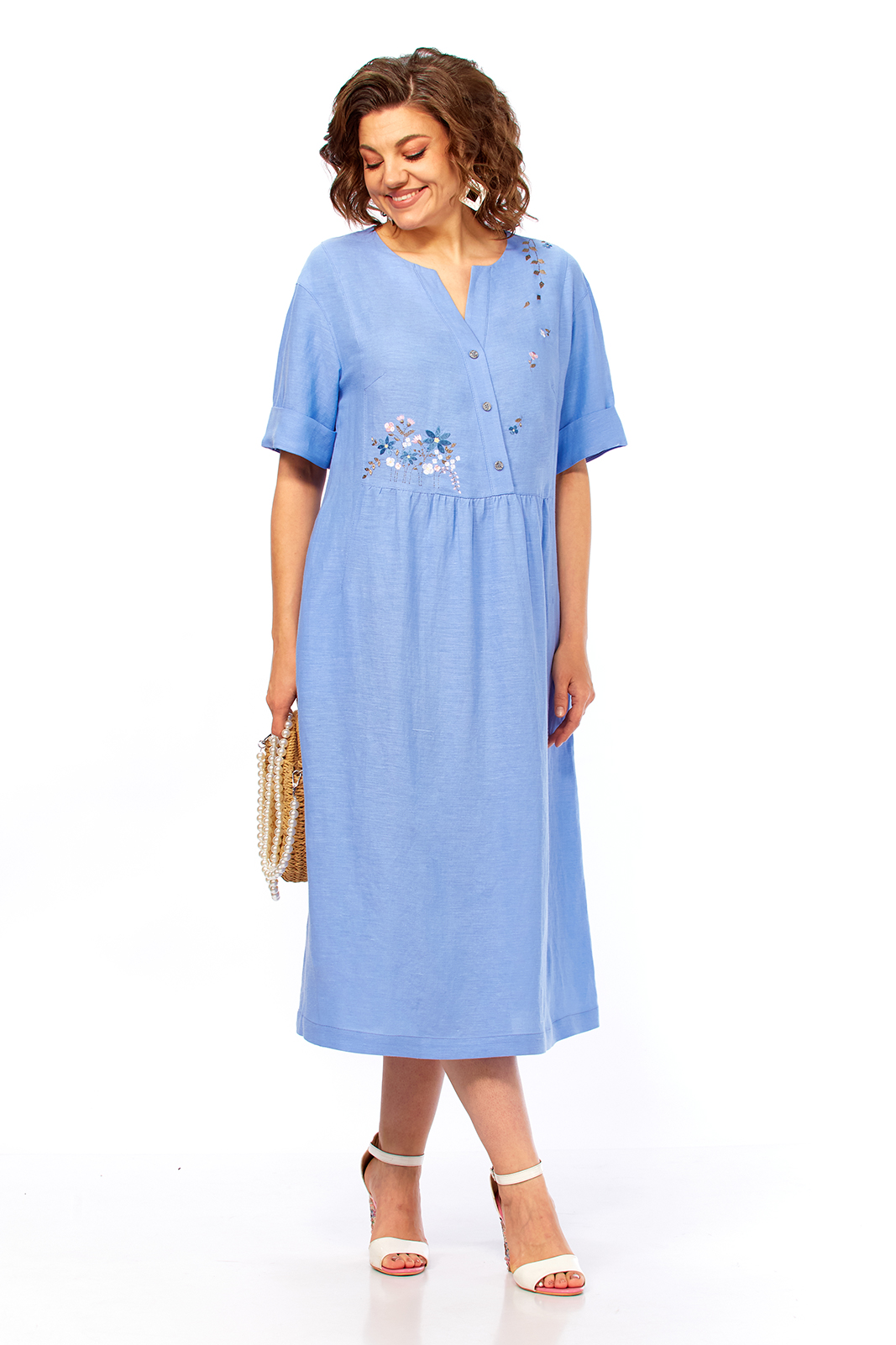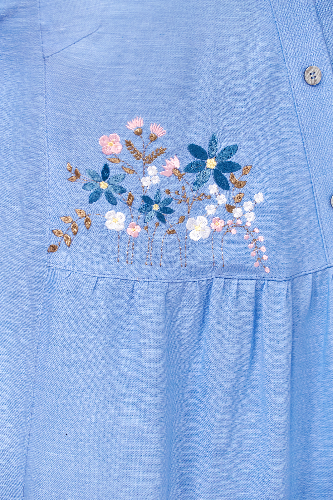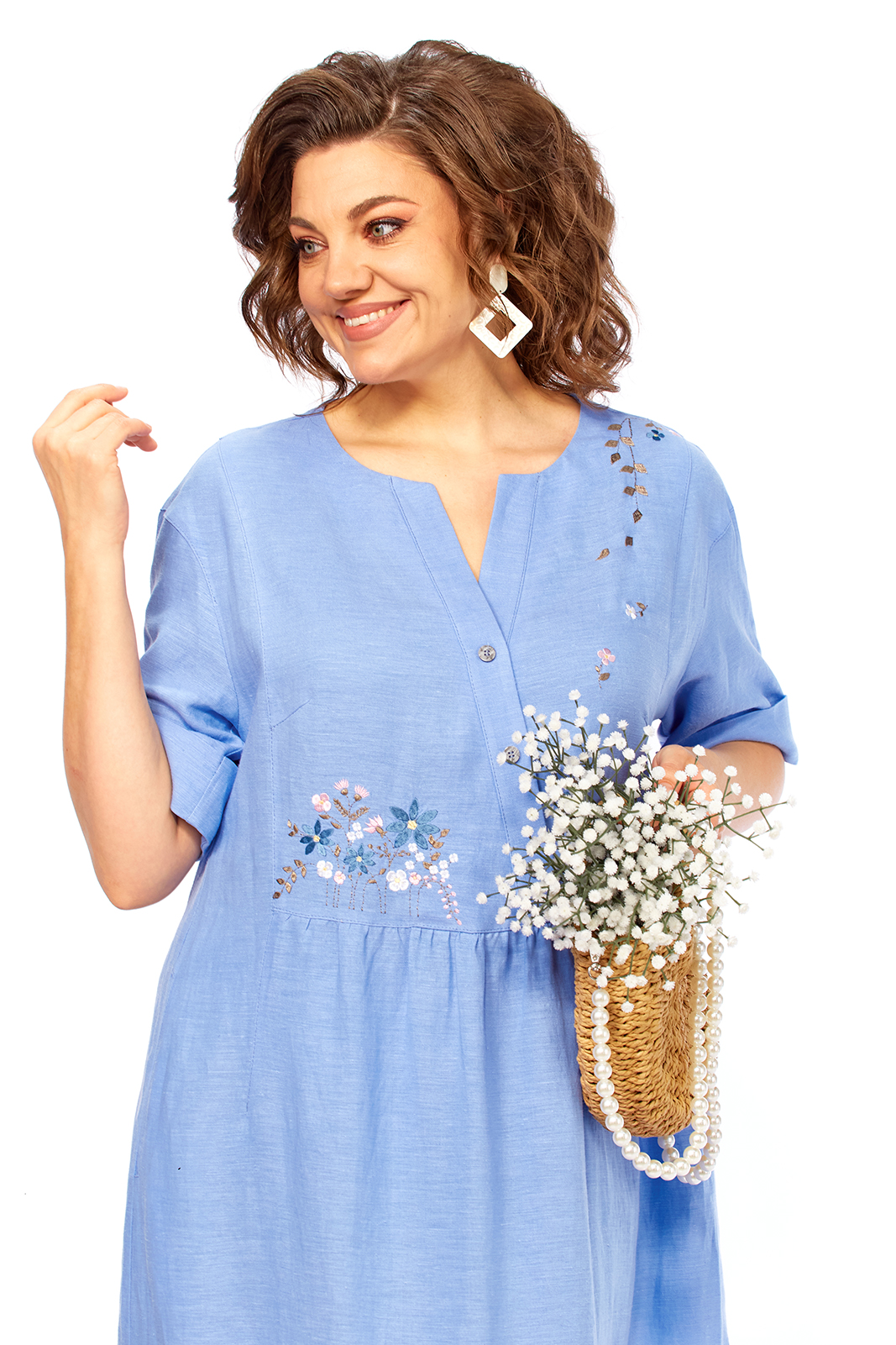 Платье женское, свободного силуэта выполнено из натуральной ткани. Горловина фигурной формы. Платье отрезное по линии талии и слегка присобрано. В верхней части переда обработана имитация застежки на запах. Линия плеча слегка спущена. Рукава с отложными манжетами. В боковых швах обработаны карманы. Изделие дополнено дизайнерской вышивкой.